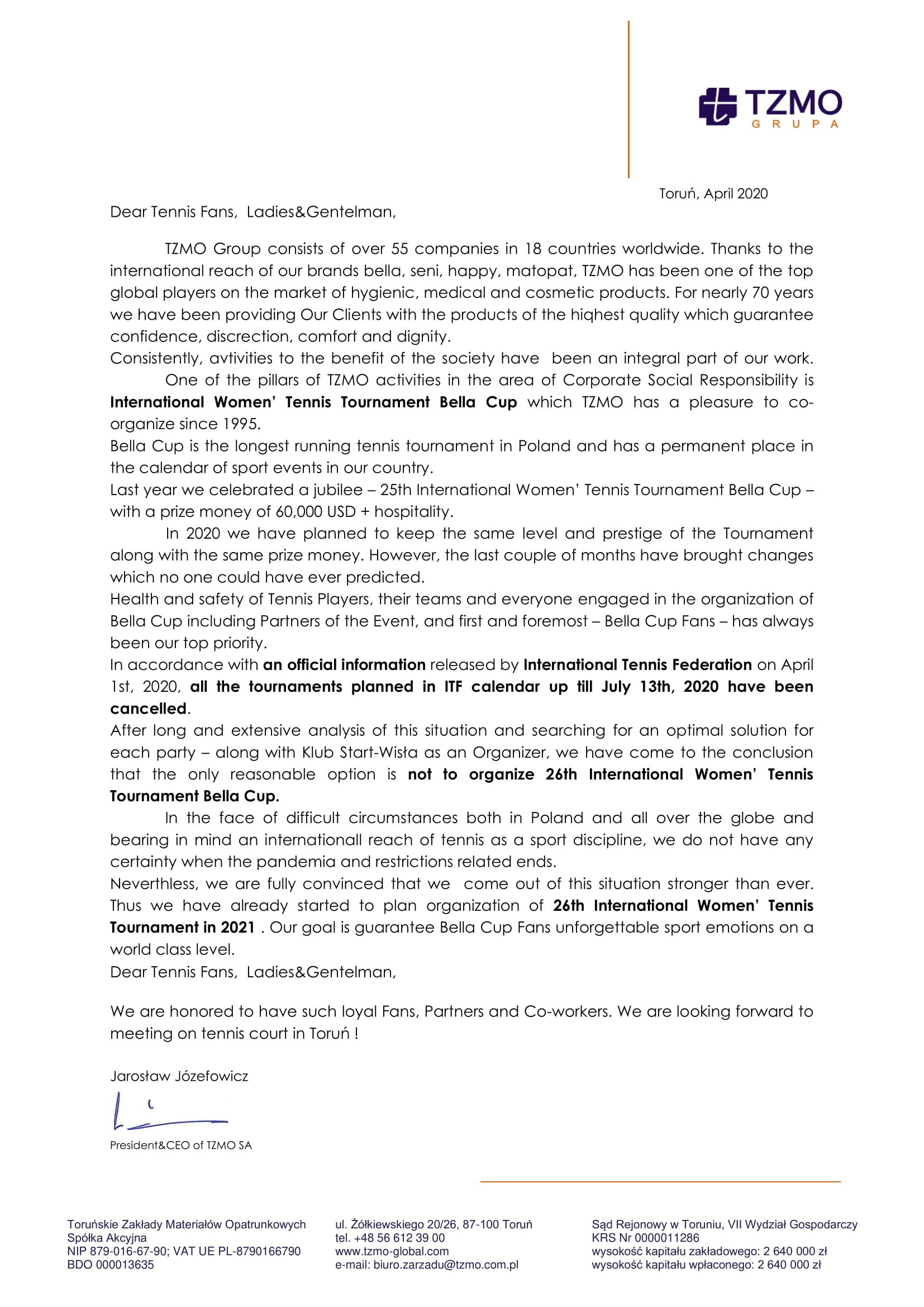 Together with the Tournament Organizer - Start Wisła Toruń Club, we made a difficult but responsible and only right decision. The 26th International Women's Tennis Cup Bella Cup is postponed to 2021.