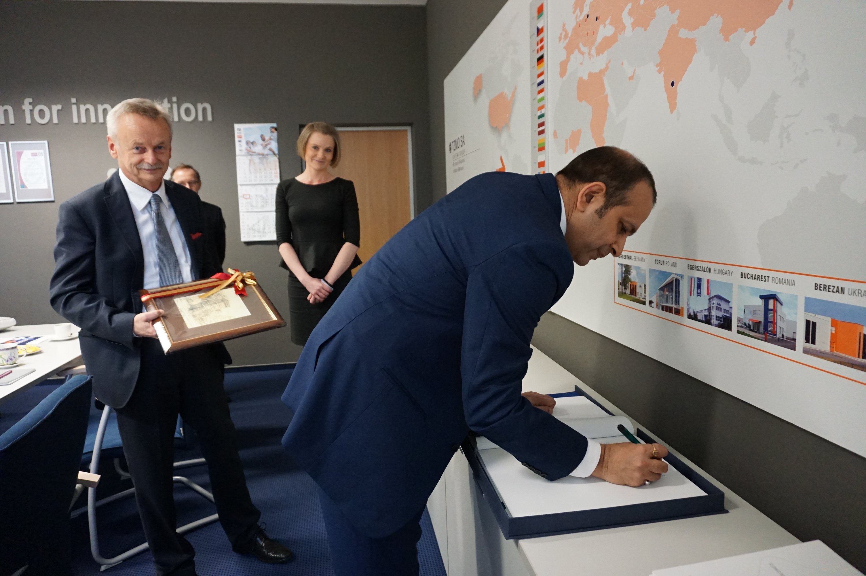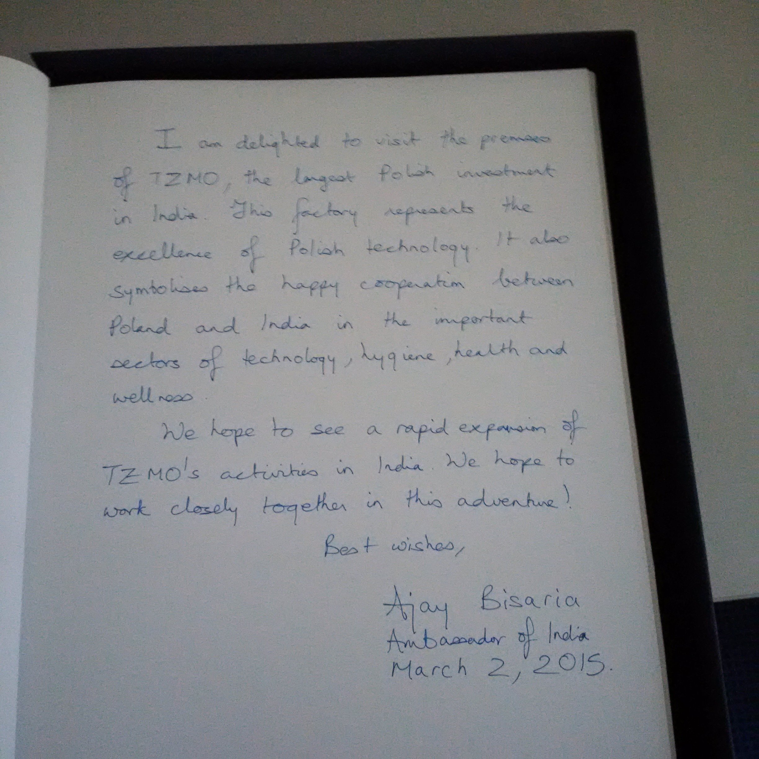 Mr. Jarosław Jóżefowicz, President&CEO of TZMO SA presented business activities of TZMO Group in India as well as plans for future expansion. His Excellency made a note in our visitors' book in which he hopes for rapid growth of TZMO Group in India and close cooperation in future.