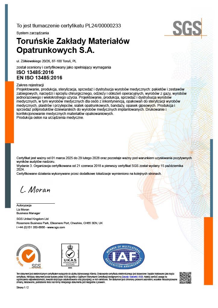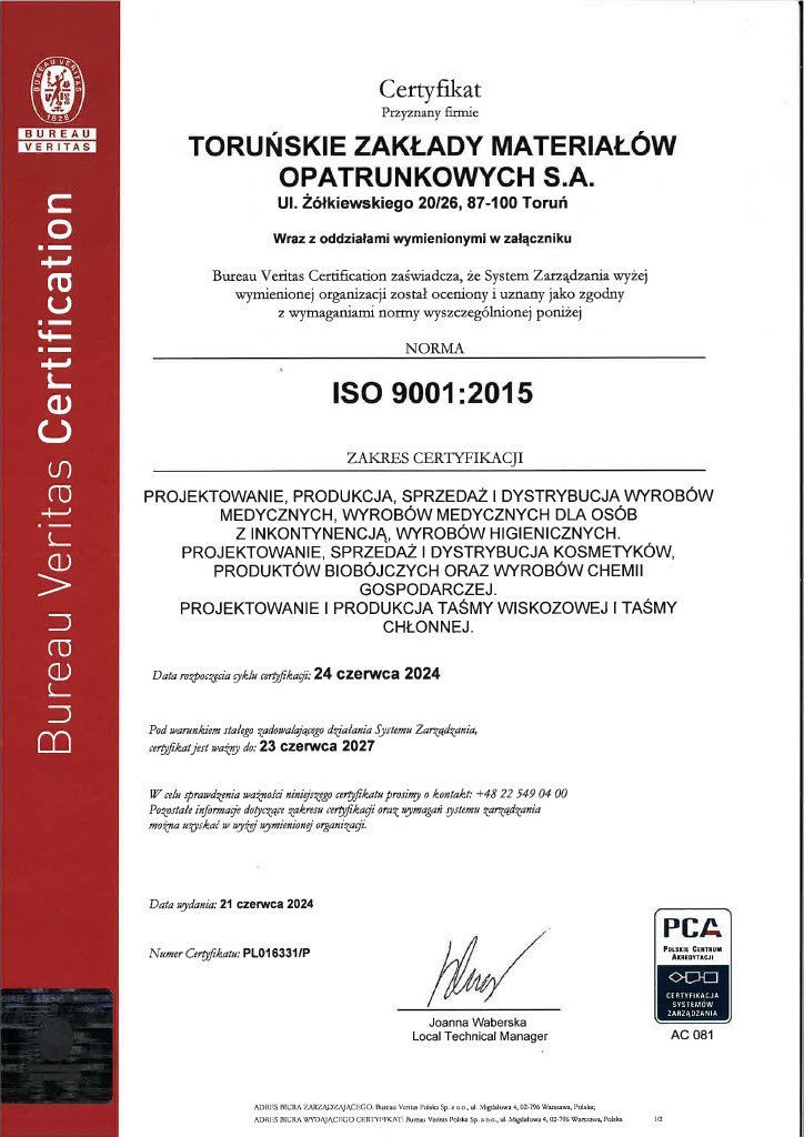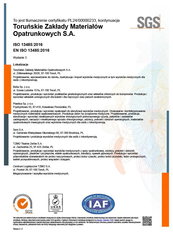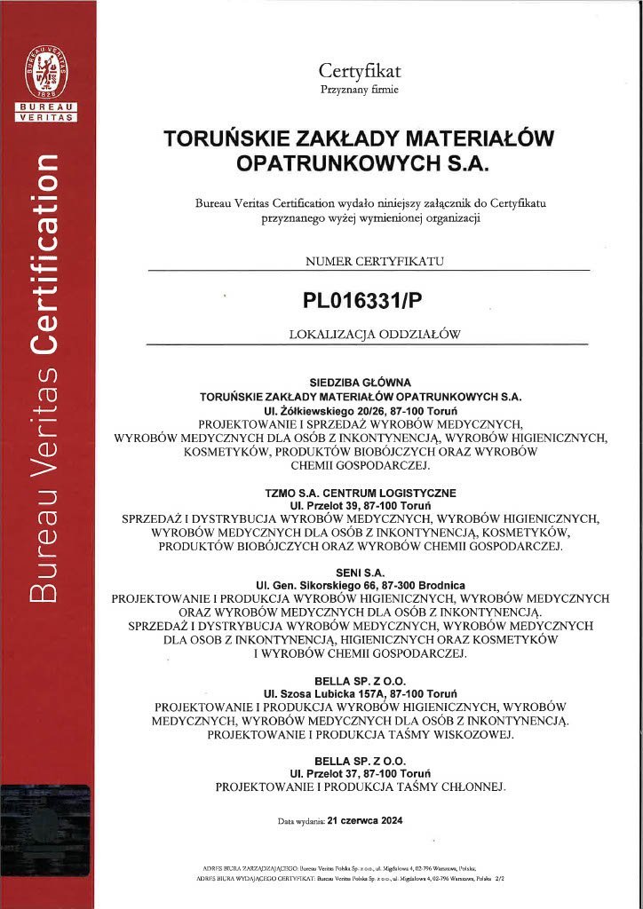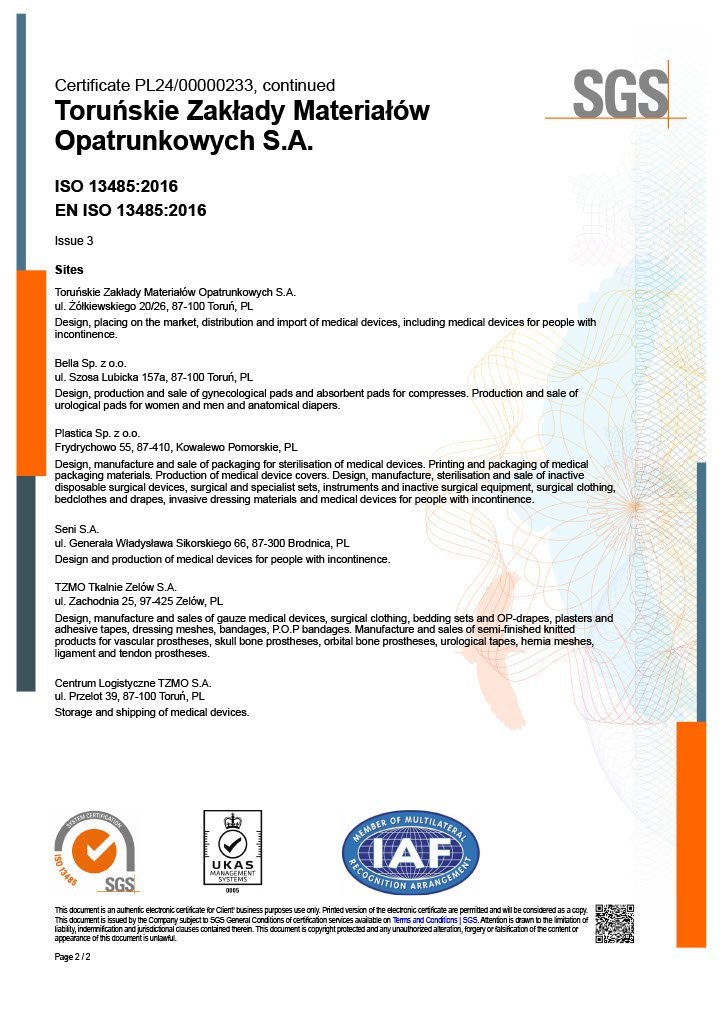 To confirm that we have met customer expectations, legal requirements and ensured the safety of our products and services, we have implemented Quality Management Systems. Our efforts resulted in ISO 9001 Quality Management System Certification (first certification - 1997) and ISO 13485 (first certification - 2005) covering TZMO SA and production companies Bella sp. z o.o., Seni Sp. z o.o. and Plastica sp. z o.o., which has an integrated quality management system (in accordance with ISO 9001, ISO 13485, ISO 14001).
