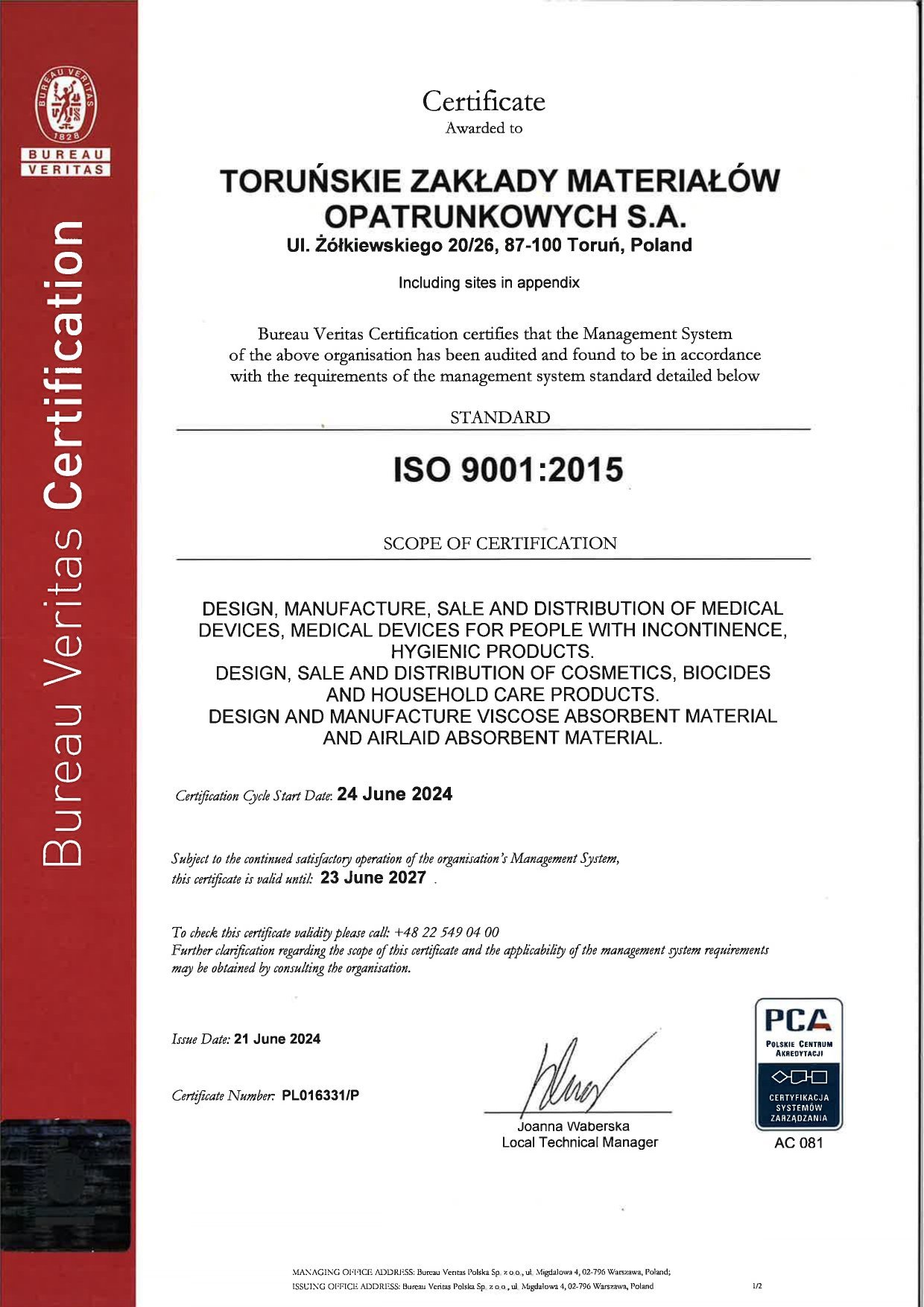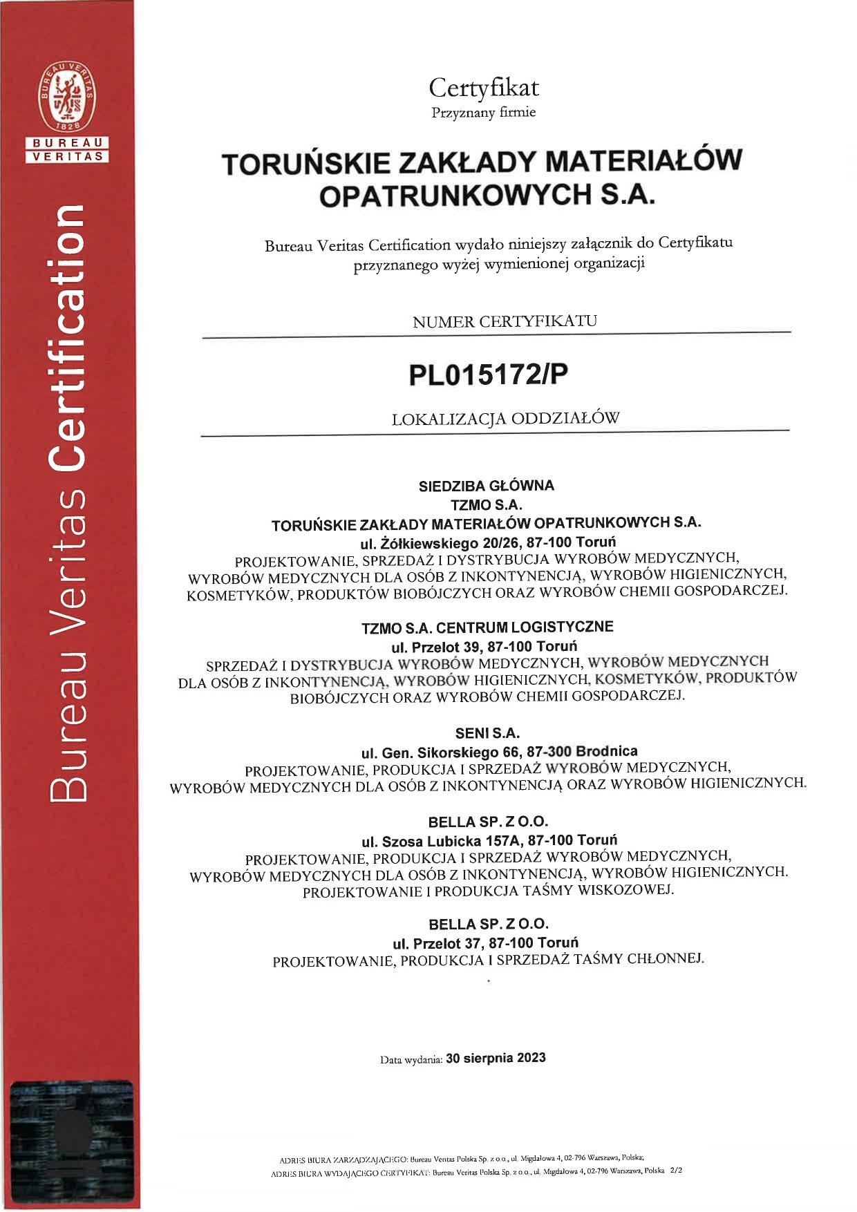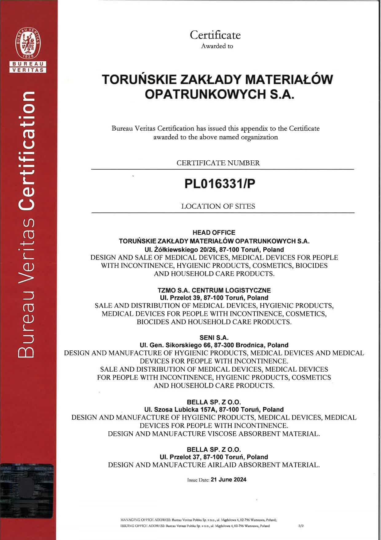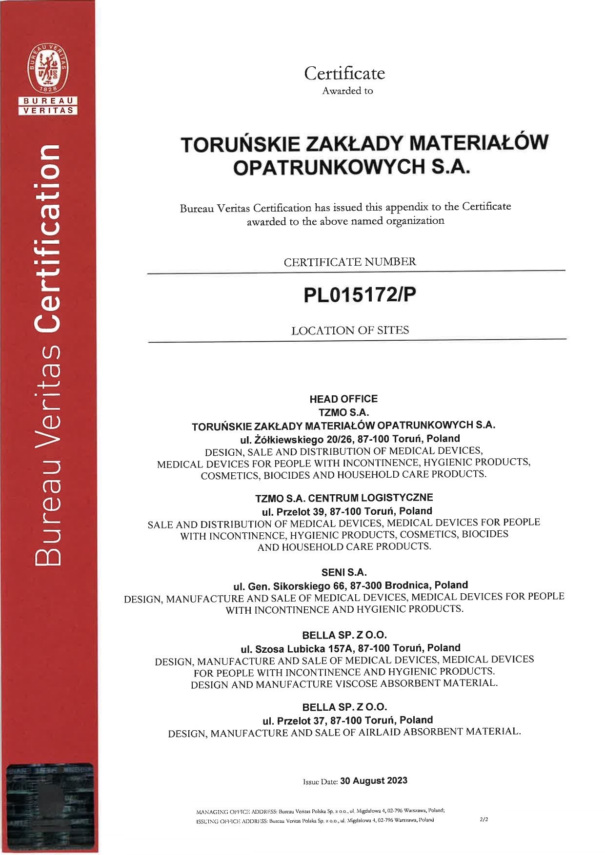 To confirm that we have met customer expectations, legal requirements and ensured the safety of our products and services, we have implemented Quality Management Systems. Our efforts resulted in ISO 9001 Quality Management System Certification (first certification - 1997) and ISO 13485 (first certification - 2005) covering TZMO SA and production companies Bella sp. z o.o., Seni Sp. z o.o. and Plastica sp. z o.o., which has an integrated quality management system (in accordance with ISO 9001, ISO 13485, ISO 14001).