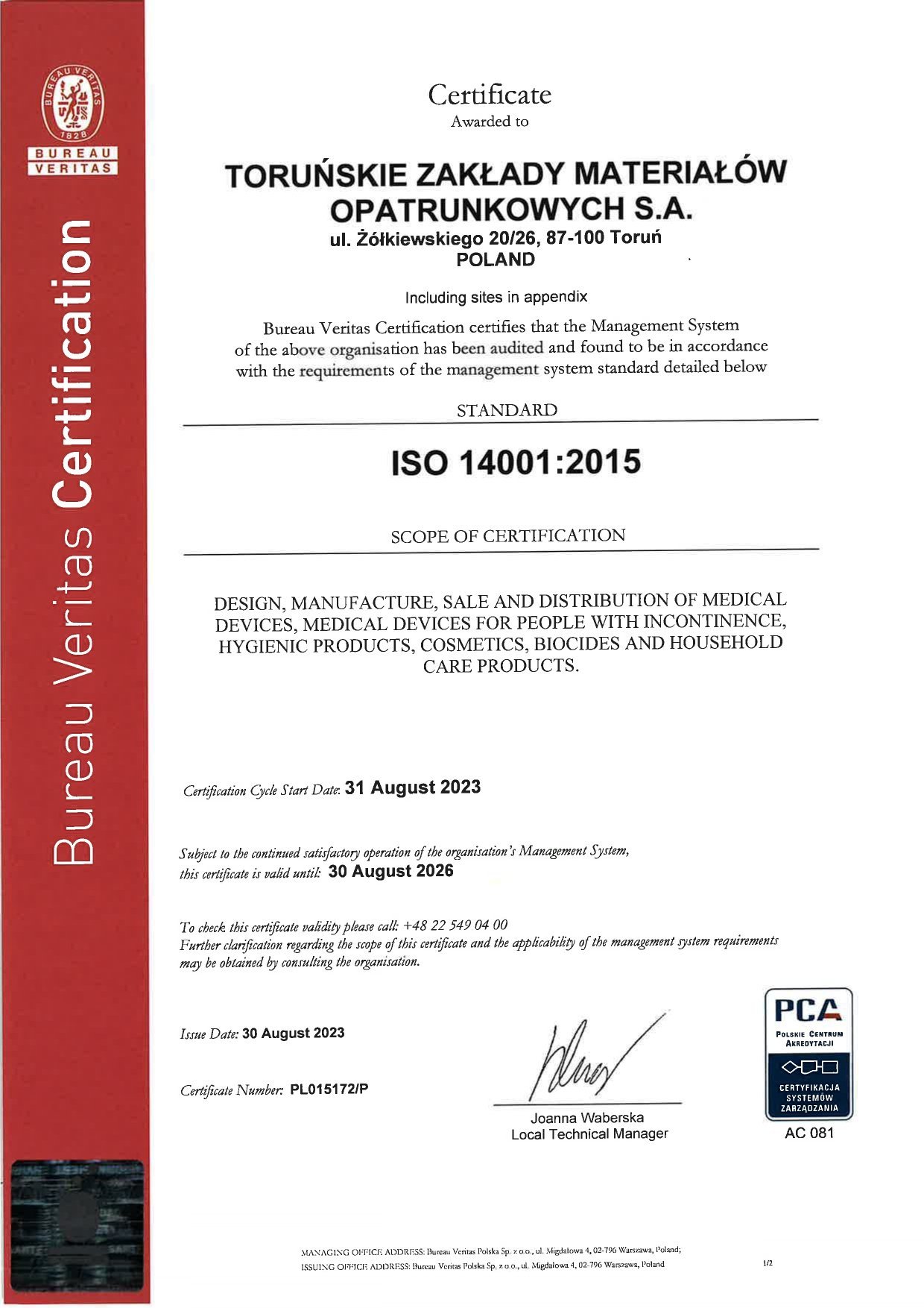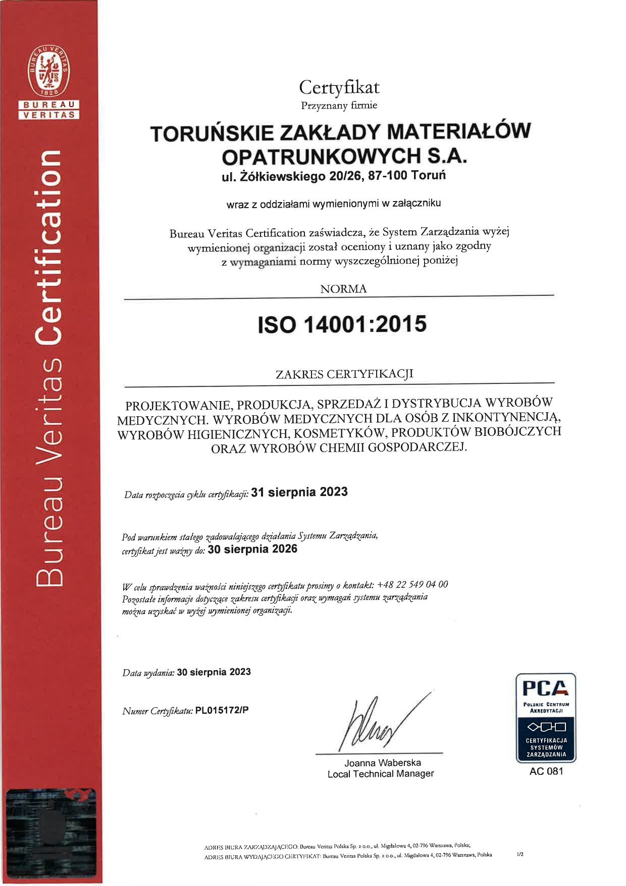 In 2020, TZMO SA was certified as an environmental management system ISO14001 compliant.
